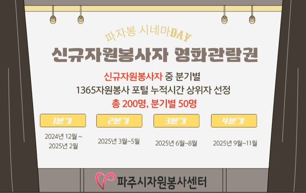 (사)파주시자원봉사센터는 신규 자원봉사자의 참여를 격려하고 활동의 의욕을 높이기 위해 신규 자원봉사자 인정 보상제도의 일환으로 ‘파자봉 시네마DAY’ 프로그램을 운영하고 있다.